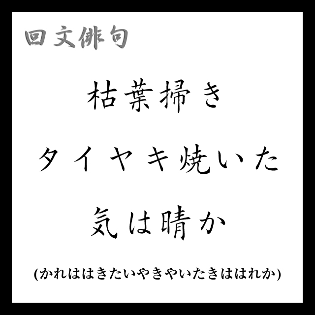枯葉掃きタイヤキ焼いた気は晴か(かれははき,たいやきやいた,きははれか)